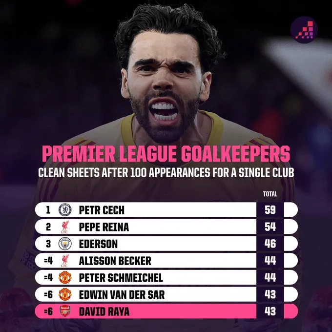 虎扑03月05日讯 本轮客战布莱顿,阿森纳门将拉亚迎来了英超生涯的第100场比赛,并帮助球队以1-0获胜。在这场比赛后,他以43场零封与范德萨并列,跻身英超历史上在单个俱乐部出场100场后的零封榜单前列。英超达百场门将零封场次榜(单个俱乐部):切赫(切尔西) - 59场雷纳(利物浦) - 54场埃德森(曼城) - 46场阿利松(利物浦) - 44场舒梅切尔(...